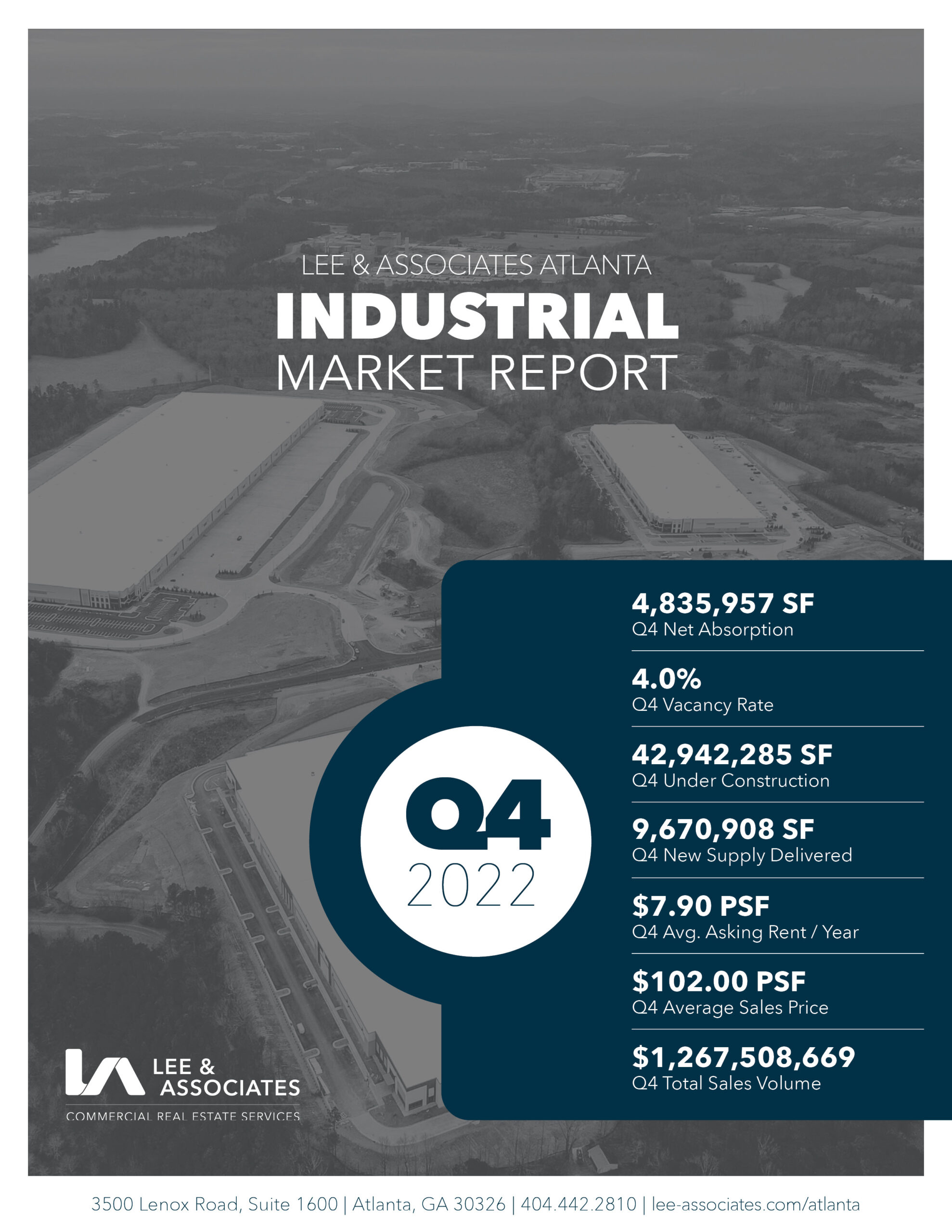 While demand for industrial space continues to prosper throughout Atlanta, there was a slight slowdown in Atlanta’s industrial market in Q4 2022. Vacancies have risen slightly off of record lows reached in late 2021, ending Q4 2022 with a 30 basis point jump to 4%. While demand and leasing velocity remain strong, rising vacancy and availability should provide relief for new and expanding Atlanta area tenants. The metro’s development pipeline continues to thrive, ending Q4 at 42,942,285 SF under construction, with 26% of that being pre-leased. In 2022, 36.2 MSF of new industrial inventory was added to the market, 62% of which was pre-committed. Industrial capital markets activity slowed in Q4, but exceeded $1.2 billion, a healthy total and on par with the 4-year average. However, buyer and seller pricing expectations are widening due to in part to a less certain interest rate environment. Average cap rates are up 50 basis points year-over-year, but average pricing per SF remains steady at $102 PSF.