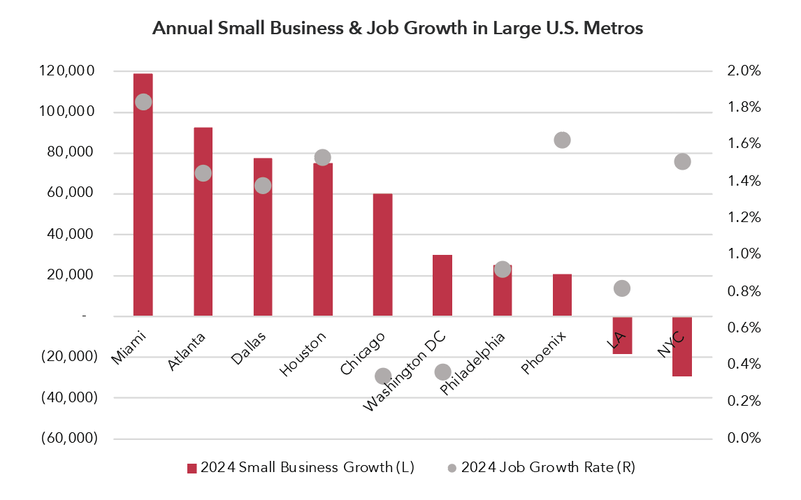 One trend to watch in 2025 will be small businesses growth. Atlanta’s share of small businesses grew by more than 92,000 in 2024, second only to Miami, and employed more than 1 million. According to the U.S. Small Business Administration (SBA), small businesses (generally defined as firms with fewer than 500 employees) have historically been responsible for around two-thirds of net new jobs created in the United States. Business and job growth, in conjunction with an expanding return-to-office (RTO) trend, provide inertia for office space demand.
