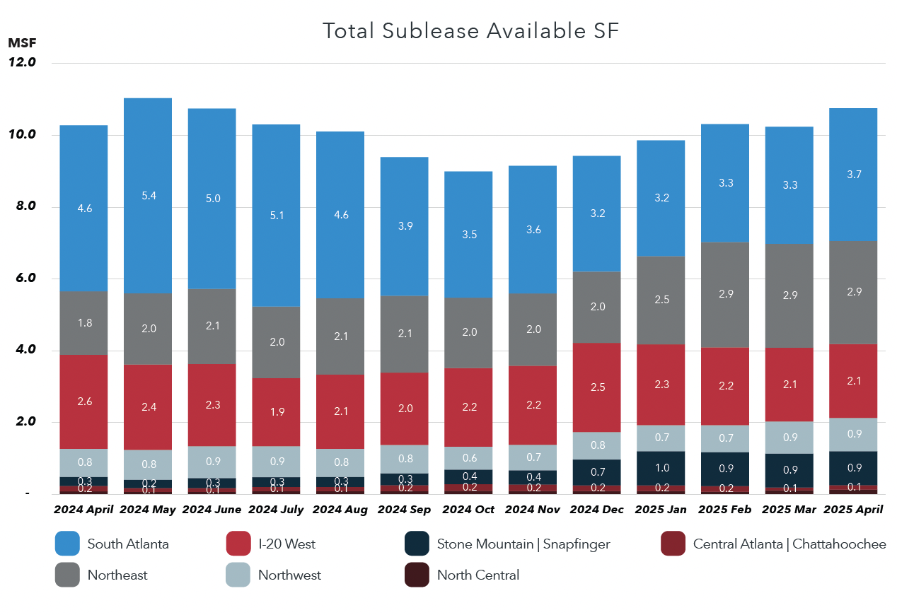 Sublease space is on the rise again in Atlanta’s industrial market. For those watching closely, it’s a familiar cycle—economic uncertainty creeps in, tenants go pencils down, and space quietly returns to the market. In April 2025, available industrial sublease space climbed to 10.8 million square feet, up from a low of 8.9 million in October. It’s a return to a pattern that anyone who’s followed this market long enough will recognize.