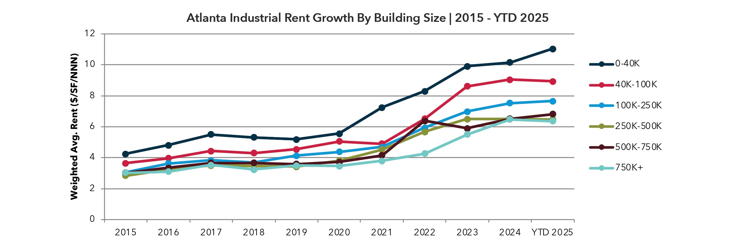 Atlanta’s industrial market has seen extraordinary rent growth over the last decade, and recent data from Lee & Associates Atlanta Research provides critical context for today’s environment of rising vacancy. Across every building size category, cumulative rent growth over the last five years exceeds 70%.