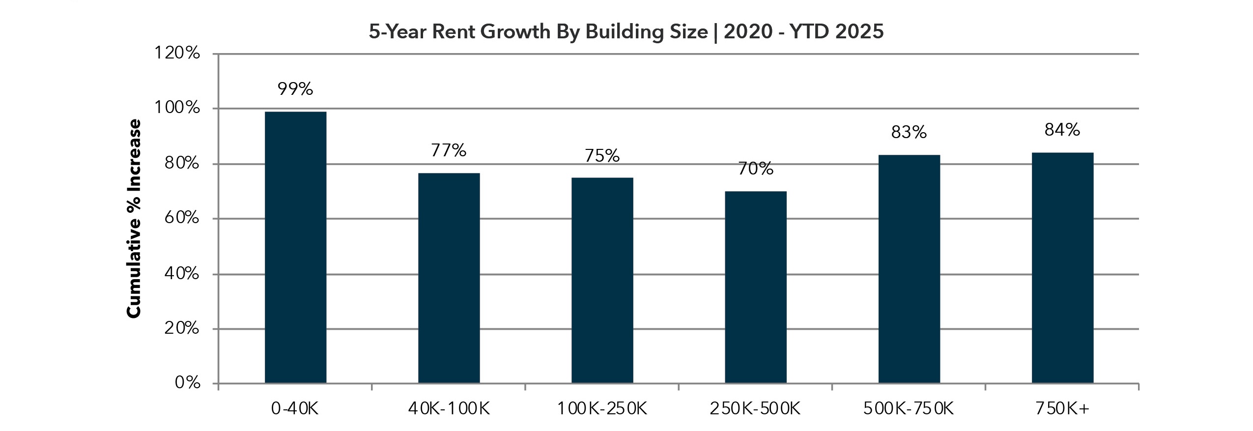 At the same time, not all size ranges continue to accelerate. In several categories, rents have flattened over the past year, signaling stabilization after an intense run-up and giving tenants some breathing room while landlords focus on occupancy.
