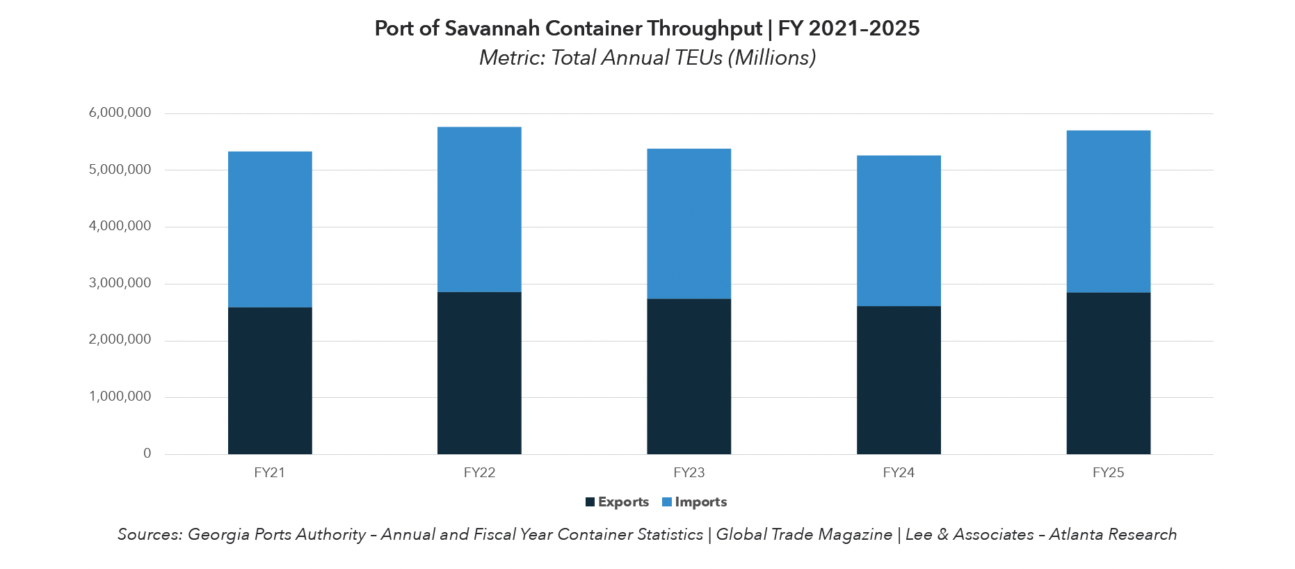 Trade activity remains a key driver of long-term industrial demand in Savannah. As detailed in Lee & Associates’ Q4 2025 Savannah Industrial Market Report (see below), vacancy remained elevated late in the year, largely reflecting the delivery of new supply following several years of accelerated development. Sustained container volumes continue to support demand fundamentals for warehouse and distribution users as the market works through this inventory.