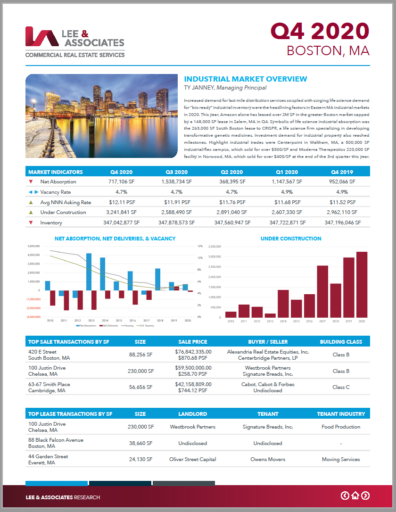 Increased demand for last mile distribution services coupled with surging life science demand for “bio ready” industrial inventory were the headlining factors in Eastern MA industrial markets in 2020. This year, Amazon alone has leased over 2M SF in the greater Boston market capped by a 148,000 SF lease in Salem, MA in Q4.
