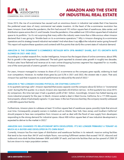 Since 2013, the rise of e-commerce has caused such an enormous boom in industrial real estate that it has become the preferred asset class of many commercial real estate investors. At the heart of the e-commerce revolution has been Amazon. Even before the pandemic, the firm had around 192 million square feet of warehouse, data center, and distribution space across the U.S. and Canada. Since the pandemic, it has added over 220 million square feet of industrial space to its portfolio.1 So it’s not surprising that many within the industry were more than a little anxious when Amazon declared that it was going to “throttle back on its e-commerce operations.”2 Why is Amazon changing its e-commerce operations and its strategy toward industrial real estate? And what does it say about the industrial sector going forward? This report will explore these questions and contend with five points that clarify the current state of industrial demand.