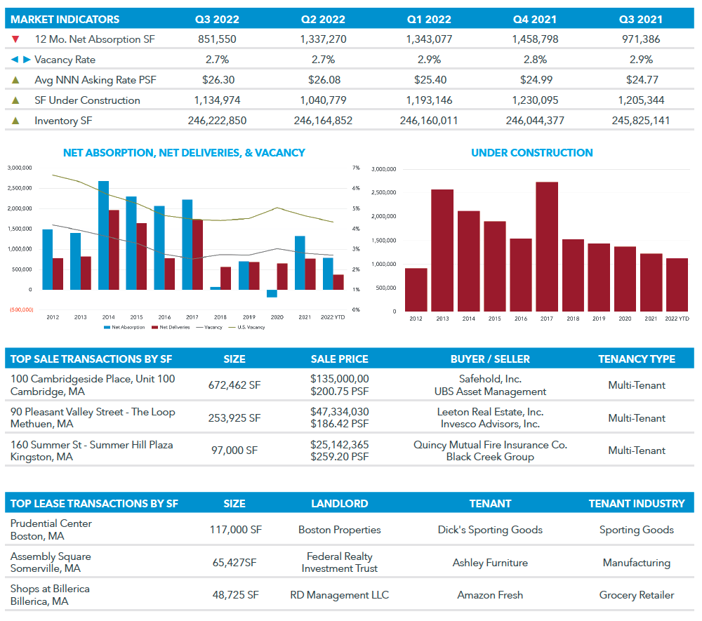 Retail in Greater Boston continues its rebound, with pockets doing extremely well. The supply constrained environment has kept vacancy below 3% resulting in upward pressure on rents despite lingering uncertainty, especially in the urban core where office occupancy is still well below pre-pandemic levels. Nonetheless, Dicks Sporting Goods’ recent lease of ~120,000 SF in the Prudential Center’s former Lord & Taylor space is a good sign for downtown retail. While average leasing rates across Greater Boston have yet to reach pre-pandemic levels, sales have set a record-breaking pace. Given the current interest rate environment, sales are not expected to keep up with this recent record sales volume of $3.3 billion over the prior 12 months.
