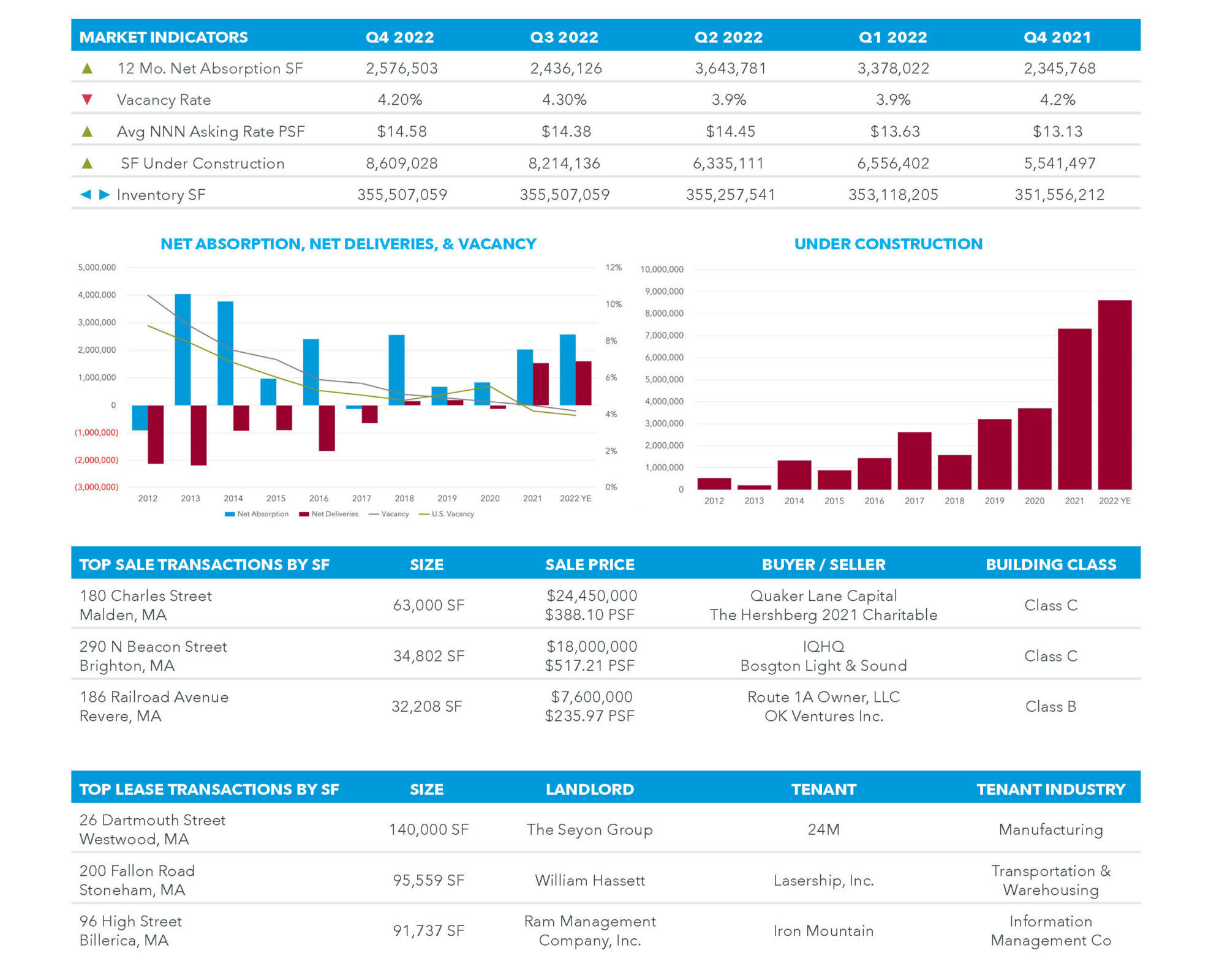 The greater Boston Industrial market held steady in the 4th quarter of 2022 at 4.2% overall vacancy and asking lease rates averaging $14.58/SF NNN. Headline leases were signed by 24M at 140,000 SF, Lasership, Inc. at 96,000 SF and Iron Mountain at 92,000 SF. Total annual absorption (for 355M SF in total inventory) was approximately 1.6M SF with minimal change in vacancy rate over the 12 month period. Sales volume, which reached $3.4B in 2022 in a market that has averaged $1.4B in industrial trades over the past 10 years, tells the real story. Industrial users seeking small and large blocks continue to compete for availability across all submarkets as the construction pipeline begins to stabilize.