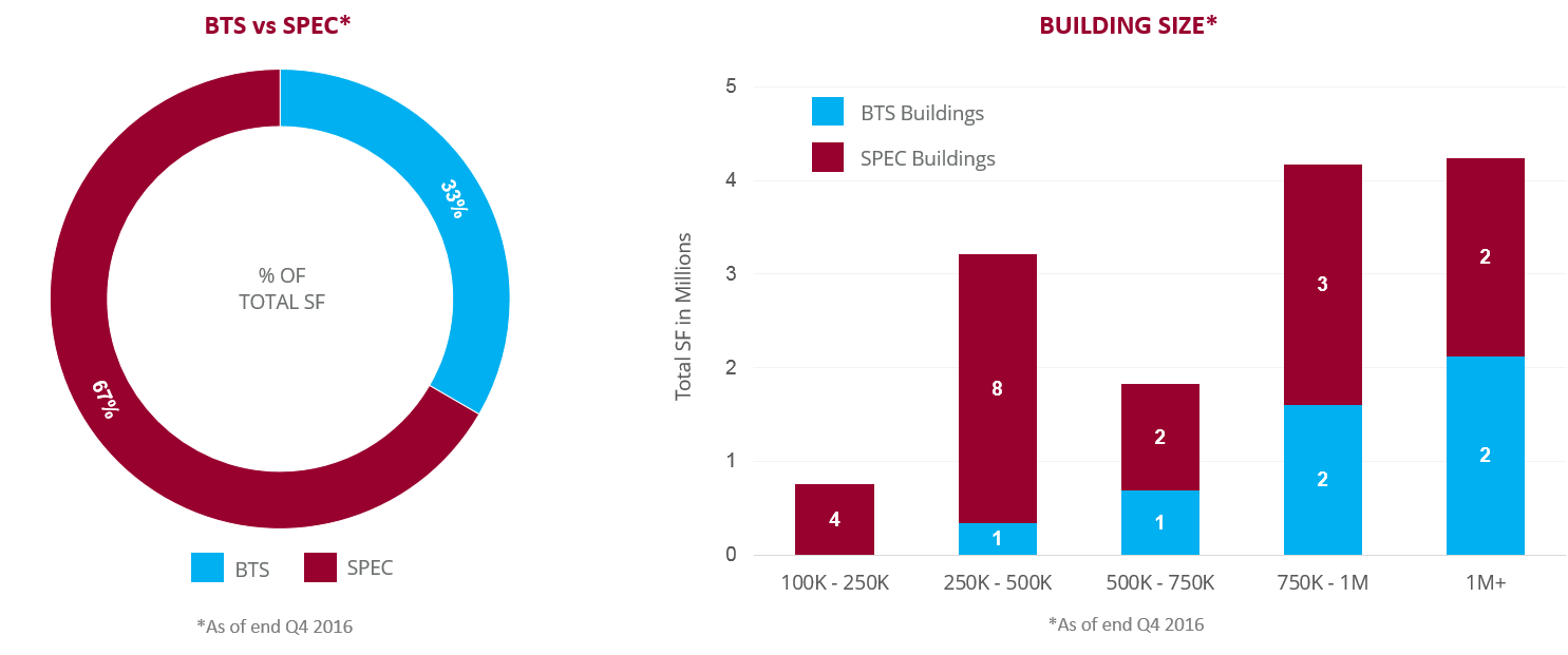 Construction activity was dominated by speculative development in 2016, accounting for 80% of all delivered space in our Core Data Set. In Central Pennsylvania, 100% of the deliveries were speculative construction; in the Lehigh Valley speculative deliveries accounted for 76% of all new inventory. Demand remained strong with only 56% of the delivered speculative space in Central PA available for lease by the end of 2016. That figure was even lower in the Lehigh Valley and Southern New Jersey, where only 28% and 20% of delivered speculative space remained available for lease. Only a few weeks into 2017, another one million square feet of the available speculative space delivered in 2016 has already been leased in the Lehigh Valley and Southern New Jersey.