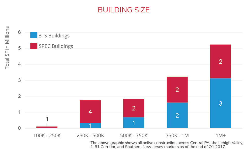 Q1 2017 ended with nearly 13 million square feet under construction. Lehigh Valley remained a leader in driving construction activity, leading the market in both the number of projects and total square footage. With 4.5 million square feet being constructed in seven on-going projects, six which are speculative starts, this spec construction activity will help refuel the submarket inventory that experienced a record breaking 2016. The first of these new deliveries are scheduled for the middle of Q2, but this availability could be short lived, as at least one of those expected deliveries has already been preleased.