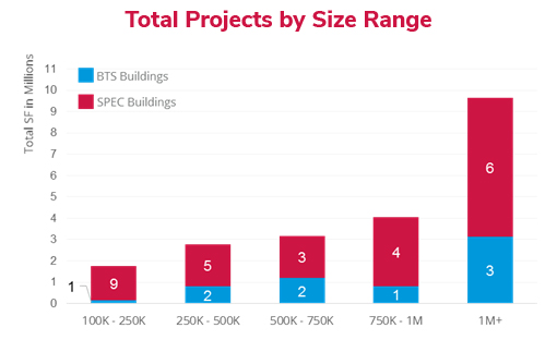 As of today, 75% of the total construction activity is speculative. The Lehigh Valley submarket is leading the way in speculative construction, with 44% of all speculative projects. 86% of the Lehigh Valley set is considered speculative. The I-81 Corridor is contributing another 26%. While Central Pennsylvania is only about 19% of all speculative projects, the average size of speculative projects in Central Pennsylvania is 867,000 square feet, almost 250,000 square feet larger than the Lehigh Valley, with the second largest average size of 630,000 square feet.