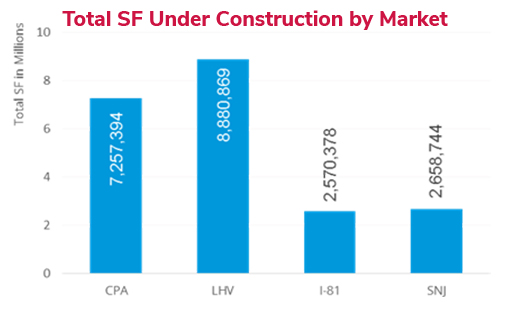 Other notable large scale developments include Dermody’s recently acquired, LogistiCenter at Midway with their other 1 million square foot built-to-suit at LogistiCenter at Logan in Gloucester County, New Jersey. In total, Dermody is leading developer construction activity with 2.5 million square feet. NorthPoint also remains one of the market’s most active developers with 2.3 million currently under construction. Market mainstays Liberty Property Trust, Duke Realty and Mericle also remain active with 2.2, 1.8 and 1.4 million square feet under construction respectively.