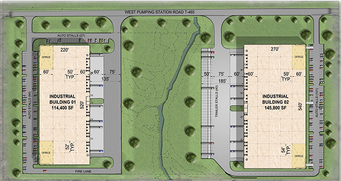 According to a news release, both buildings will feature 32-foot clear ceiling heights, two drive-in doors and the option to integrate a high percentage of commercial office.