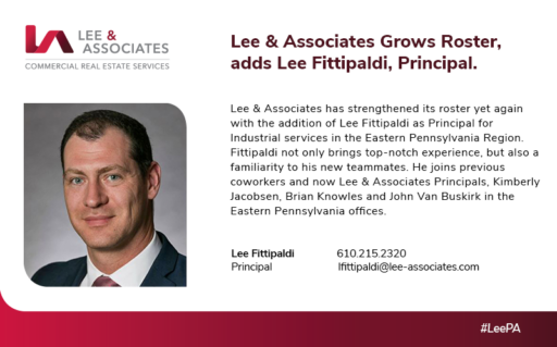 Lee & Associates has strengthened its roster yet again with the addition of Lee Fittipaldi as Principal for Industrial services in the Eastern Pennsylvania Region. Fittipaldi not only brings top-notch experience, but also a familiarity to his new teammates. He joins previous coworkers and now Lee & Associates Principals, Kimberly Jacobsen, Brian Knowles and John Van Buskirk in the Eastern Pennsylvania offices. When speaking about their previous success together, Brian Knowles said, welcoming Fittipaldi along with last month’s addition, Kimberly Jacobsen, to the Lee team is “a great fit for us.”