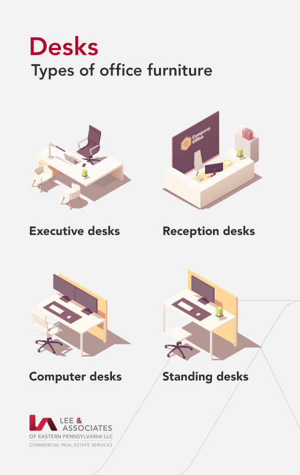 • Reception desks: These types of desks are specifically designed for receptionists and secretaries to greet and conduct business transactions with clients, visitors and staff. A reception desk usually features a wide countertop and ample sitting space.