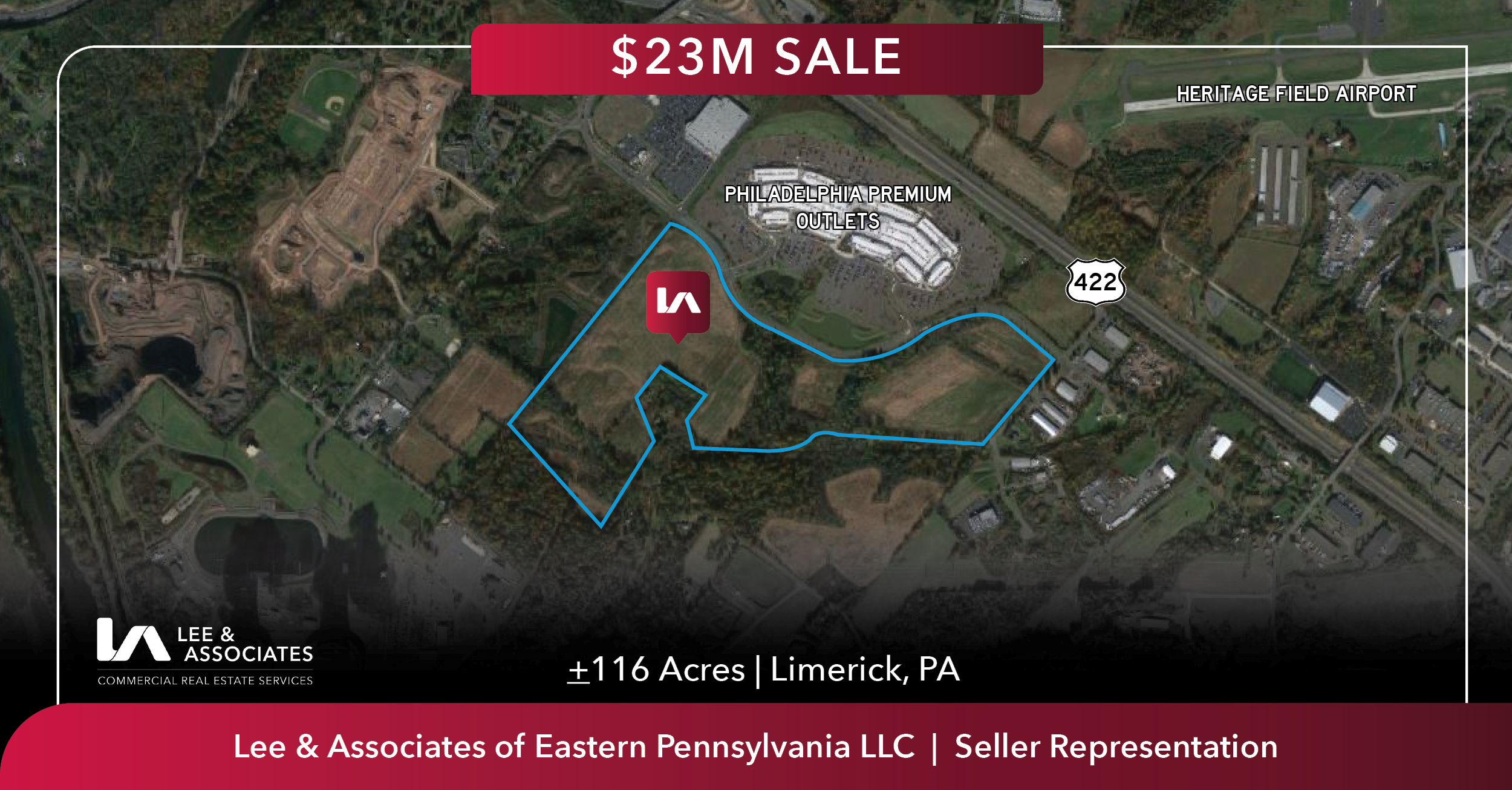Montgomery County, PA – The Capital Markets Group, headed by Bob Yoshimura and Joe Hill from Lee & Associates of Eastern Pennsylvania (“LAEP”), arranged the sale of a 110-acre, industrially zoned land site located off the Sanatoga exit of Route 422 in Limerick, Pennsylvania. Eric Mattson and Connor Sanbower from the Lee & Associates Capital Markets group assisted in representing the Seller, Metropolitan Commercial Development.