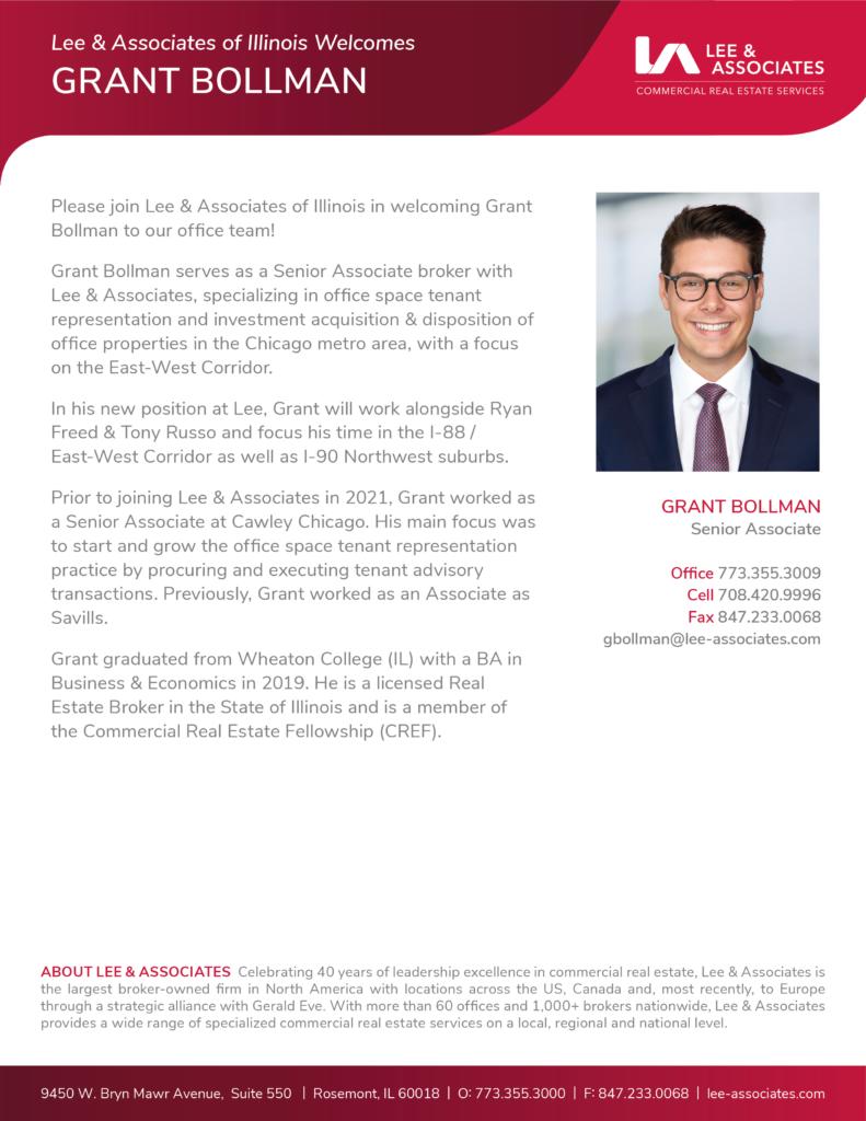 Lee & Associates of Illinois Welcomes Grant Bollman to Office Brokerage Team