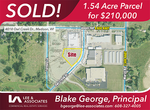 MADISON – Lee & Associates Madison announces the sale of a 1.54 acre parcel located at 4018 Owl Creek Dr. in Madison, Wisconsin. Blake George of Lee & Associates Madison represented both the buyer and seller in the transaction.