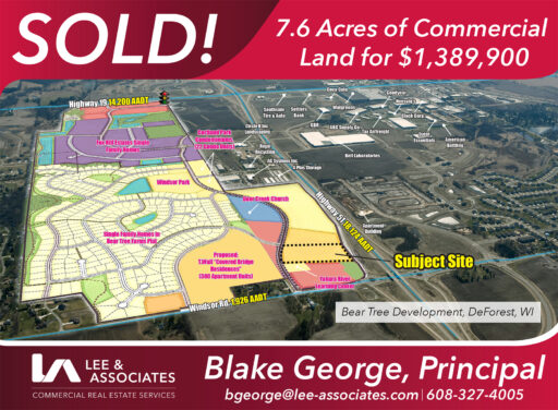 MADISON – Lee & Associates Madison announces the sale of 7.6 acres of commercial land for $1,389,900 located in the Bear Tree Development in DeForest, Wisconsin. Blake George of Lee & Associates Madison represented the seller in this transaction.