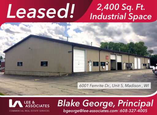 MADISON – Lee & Associates Madison announces the leasing of a 2,400 sq. ft. industrial space located at 6001 Femrite Drive in Madison, Wisconsin. Blake George of Lee & Associates Madison negotiated the lease in the transaction.
