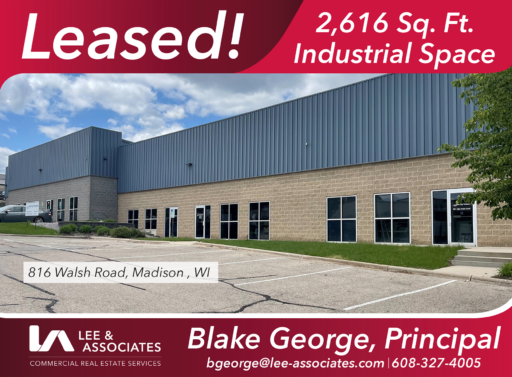 MADISON – Lee & Associates Madison announces the leasing of a 2,616 sq. ft. industrial space located at 816 Walsh Road in Madison, Wisconsin. Blake George of Lee & Associates Madison negotiated the lease in the transaction.