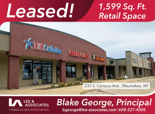 MADISON – Lee & Associates Madison announces the leasing of a 1,599 sq. ft. retail space located at 233 S. Century Avenue in Waunakee, Wisconsin. Blake George of Lee & Associates Madison negotiated the lease in the transaction.