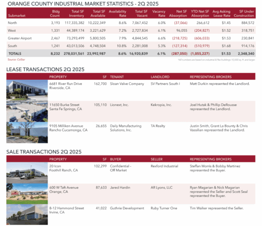 Countywide, there are 278 million SF of space in 8,232 buildings. Net absorption in the second quarter was negative 287,050 SF and was down across three of the county’s four submarkets. Although first-half demand was 1.1 million SF in the red, it was an improvement from the 2.7-million-SF contraction through Q2 a year ago.