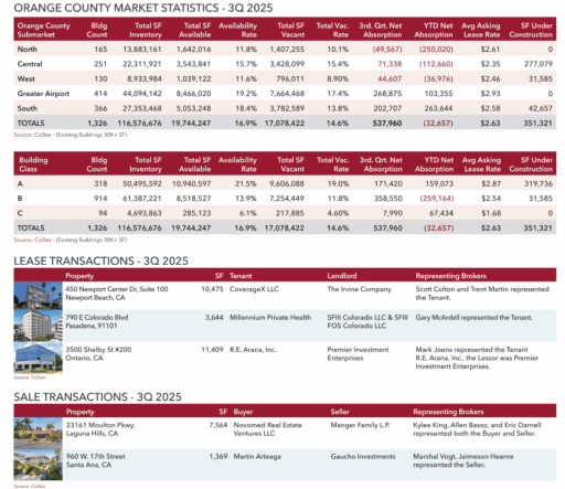 There was 358,550 SF of third-quarter tenant expansion in Class B properties, which total 61.4 million SF in 914 buildings countywide. The largest office lease of the third quarter and for the year was Hyundai’s 67-month agreement for 134,000 SF at 2300 Main Street in Irvine. Foundation Building Materials leased a 48,972-SF building at 2510-2520 Red Hill Ave. in Santa Ana.