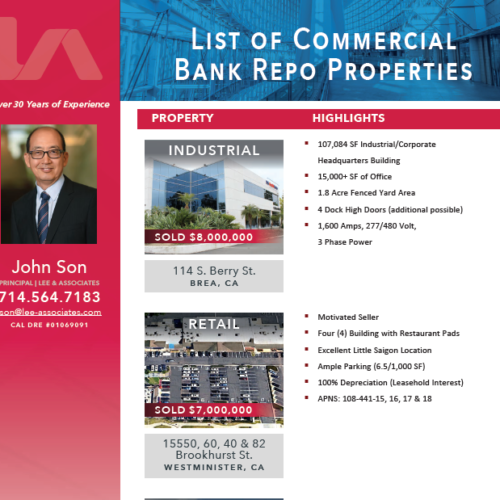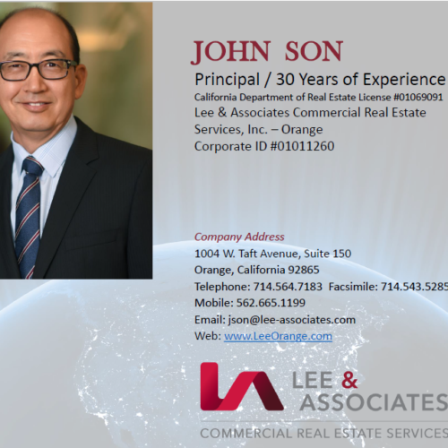 John Son joined Lee & Associates as a Principal in 2008. Mr. Son has been in commercial real estate for over 32 years and currently advises clients regarding owner/user industrial, office and investment transactions as well as land sales and development transactions. Mr. Son is involved with many in-fill development projects and has expertise and familiarity with the entitlement process and feasibility studies for different types of developments.