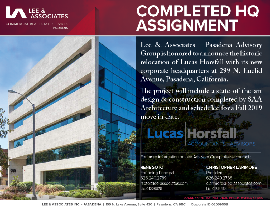 Lee & Associates – Pasadena Advisory Group is honored to announce the historic relocation of Lucas Horsfall