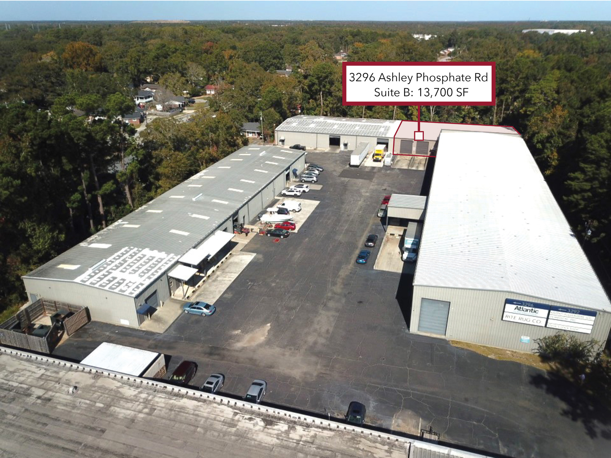 UNIT OVERVIEW 3292, Suite B, offers (+/-) 13,700 SF of clean warehouse space available in a central location on Ashley Phosphate in the established Palmetto Park. The space has 14'6'' eave heights, 19'7'' clearance at the center, provides 2 (12' X 14') dock doors. The site provides easy access, ample paved surface level parking, and excellent visibility with approximately 285' of frontage on Ashley Phosphate.