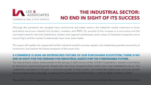 Although the pandemic has ravaged many commercial real estate sectors, the industrial market continues to thrive and attract enormous interest from lenders, investors, and REITs. On account of the increase in e-commerce and the continued need for last-mile distribution centers and regional warehouses, asset values of industrial properties are at record highs and the market fundamentals have never been better.