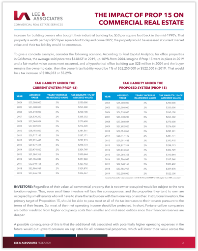 Investors: Regardless of their value, all commercial property that is not owner-occupied would be subject to the new taxation regime. Thus, even small time investors will face the consequences, and the properties they tend to own are occupied by small tenants who will have to share the tax burden with them one way or another. Institutional investors, the primary target of Proposition 15, should be able to pass most or all of the tax increases to their tenants pursuant to the terms of their leases. So, most of their net operating income should be protected. In short, Fortune-caliber companies are better insulated from higher occupancy costs than smaller and mid-sized entities since their financial reserves are deeper.