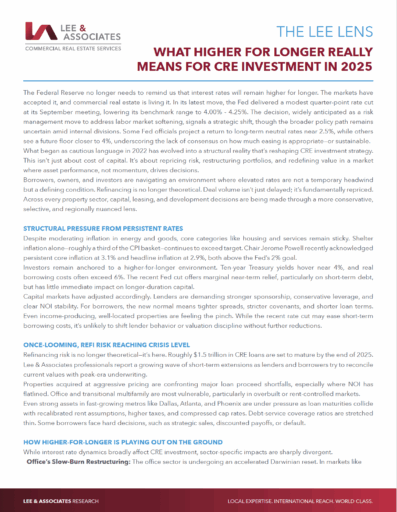 The Federal Reserve no longer needs to remind us that interest rates will remain higher for longer. The markets have accepted it, and commercial real estate is living it. In its latest move, the Fed delivered a modest quarter-point rate cut at its September meeting, lowering its benchmark range to 4.00% - 4.25%. The decision, widely anticipated as a risk management move to address labor market softening, signals a strategic shift, though the broader policy path remains uncertain amid internal divisions. Some Fed officials project a return to long-term neutral rates near 2.5%, while others see a future floor closer to 4%, underscoring the lack of consensus on how much easing is appropriate—or sustainable.
