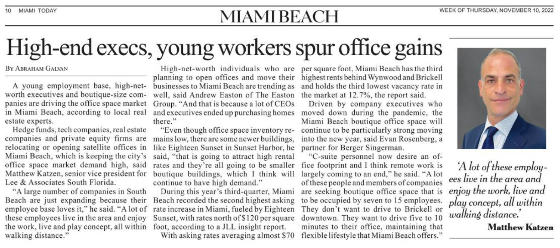 Miami Today discusses the latest Miami Beach office market trends with Lee & Associates South Florida's Multifamily Specialist, Matthew Katzen.