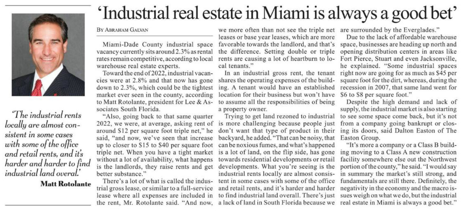 Miami Today Discusses Industrial Market with Lee & Associates South Florida President, Matthew Rotolante, SIOR, CCIM