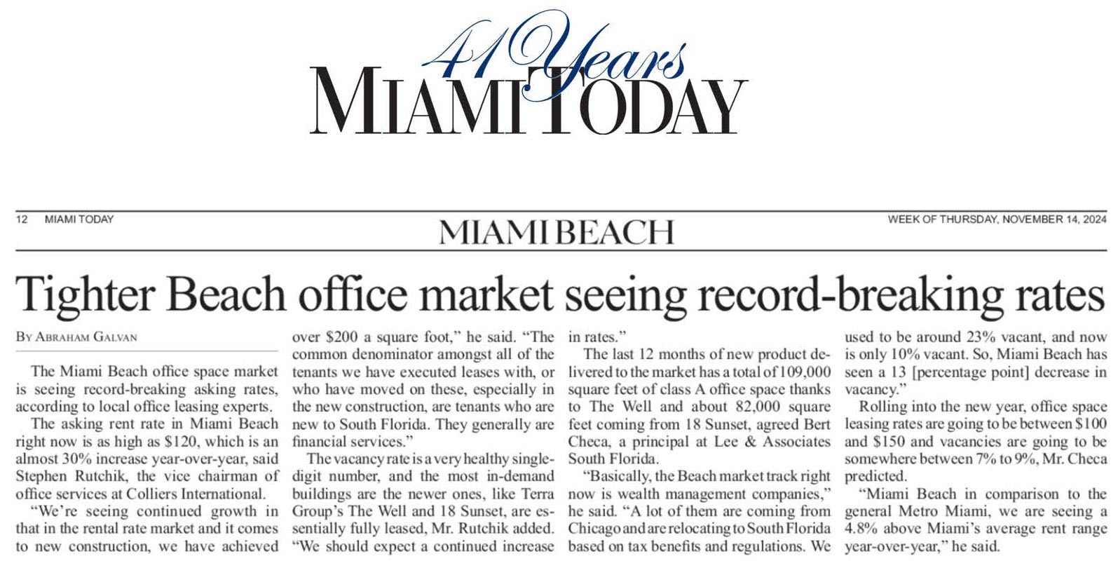 Miami Today Discusses Miami Beach Office Market with Lee & Associates South Florida Principal, Bert Checa